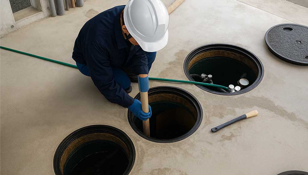 東名興産株式会社では、専門知識をもったスタッフが定期的にお宅に訪問し、浄化槽の保守点検業務を引受けます。