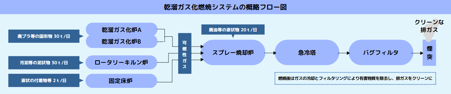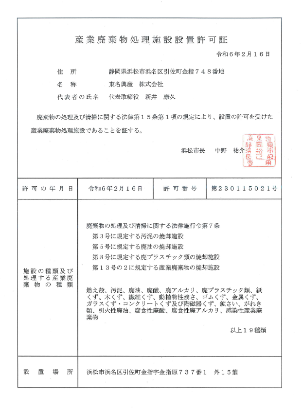 焼却汚泥、廃油、引火性廃油2.792t/日焼却施設汚泥、廃油、廃酸、廃アルカリ、廃プラスチック、紙くず、木くず、動植物性残さ、ゴミくず、金属くず、ガラス・コンクリートくず、がれき類、鉱さい、燃え殻、引火性廃油、腐食性廃酸、腐食性廃アルカリ、感染性業廃棄物82.0t/日